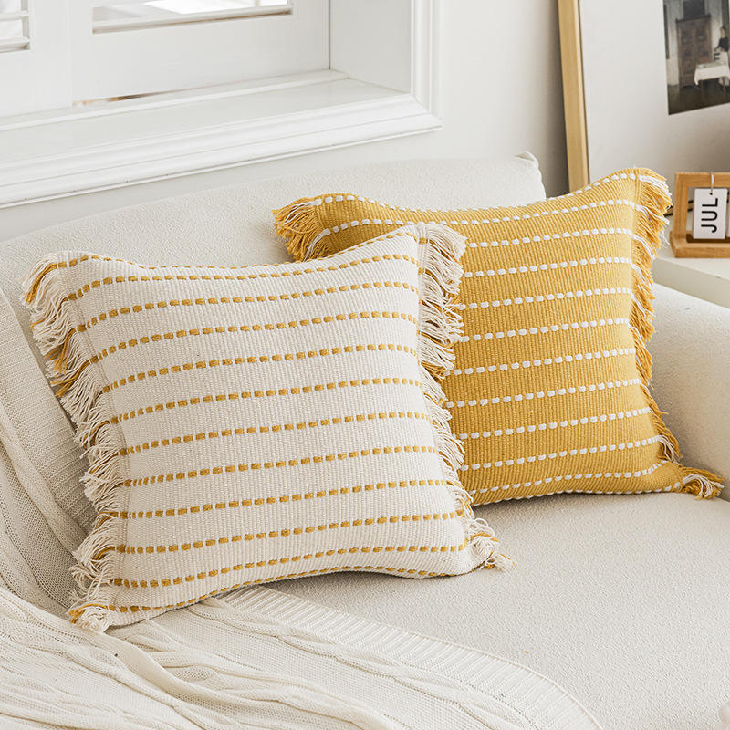 Minimalist Yellow Striped Throw Pillows Square Cotton Cushion Cover With Tassel Decor For Living Room Sofa Bed Home Car