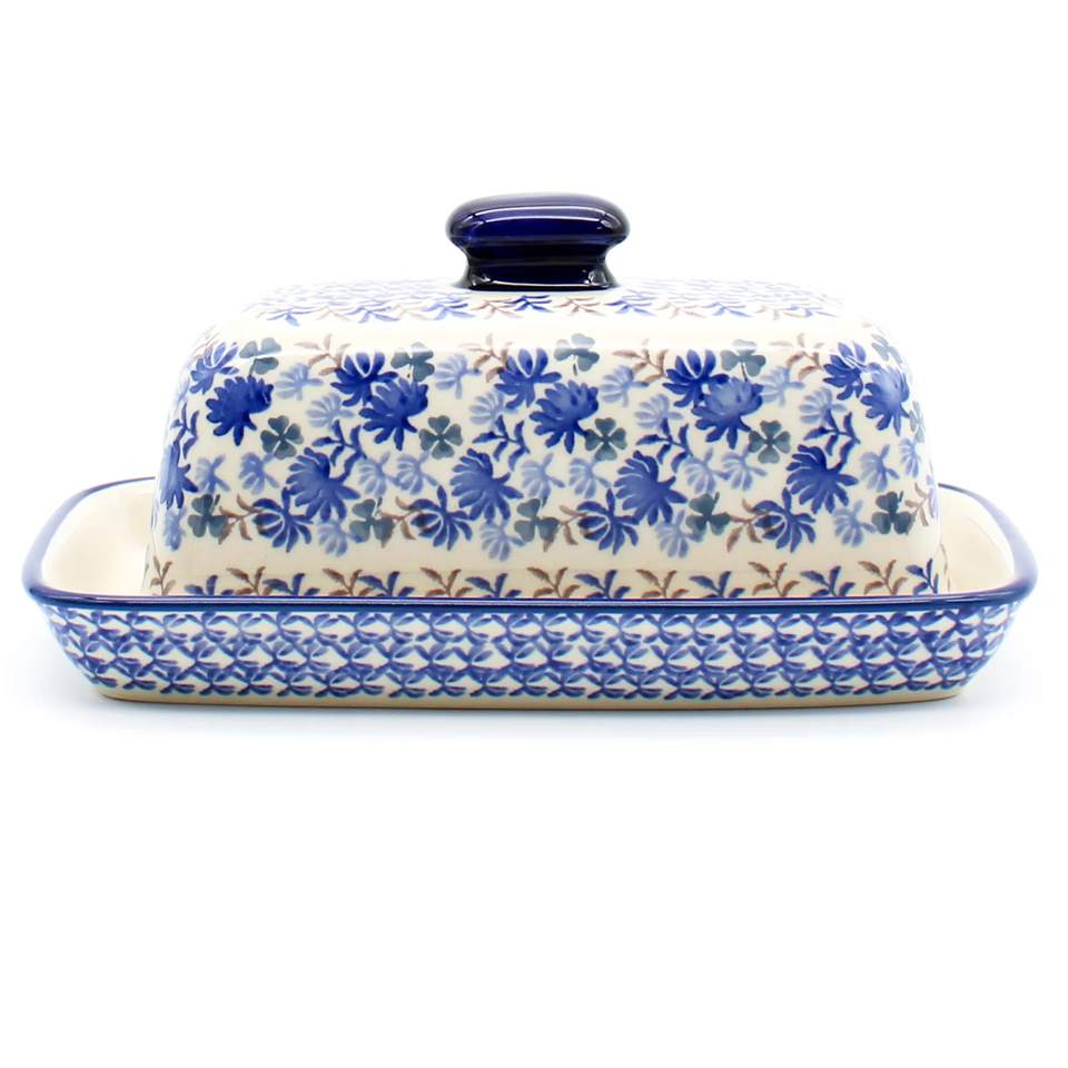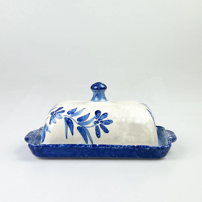 Minimalist cream ceramic butter dish with a simple blue floral decal is versatile and classic, available at wholesale prices.