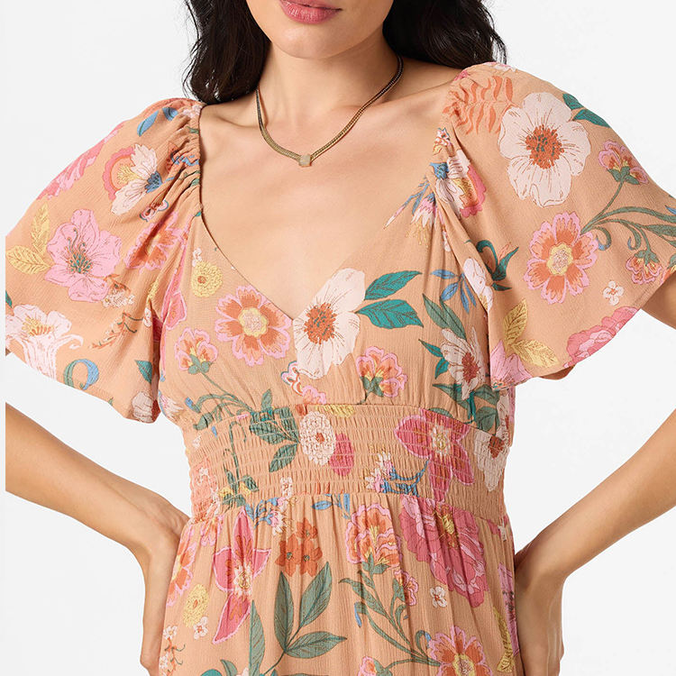 Minimum order quantity: Beach print V-neck pleated waist mini dress custom rayon casual dress for women