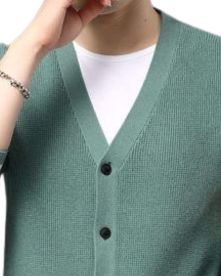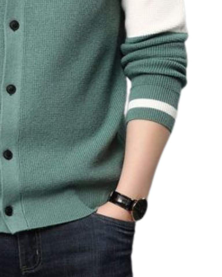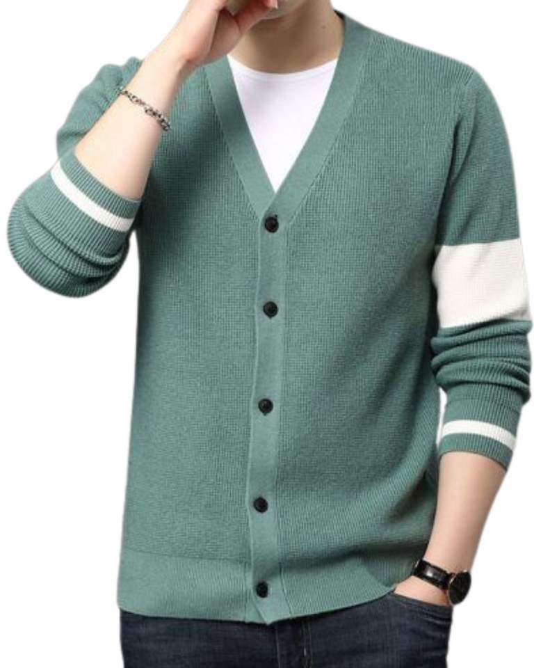 Mint Green White Striped Sleeve V Neck Knitted Cardigan Sweater With Button Closure Soft Cotton Touch Fabric Casual Style