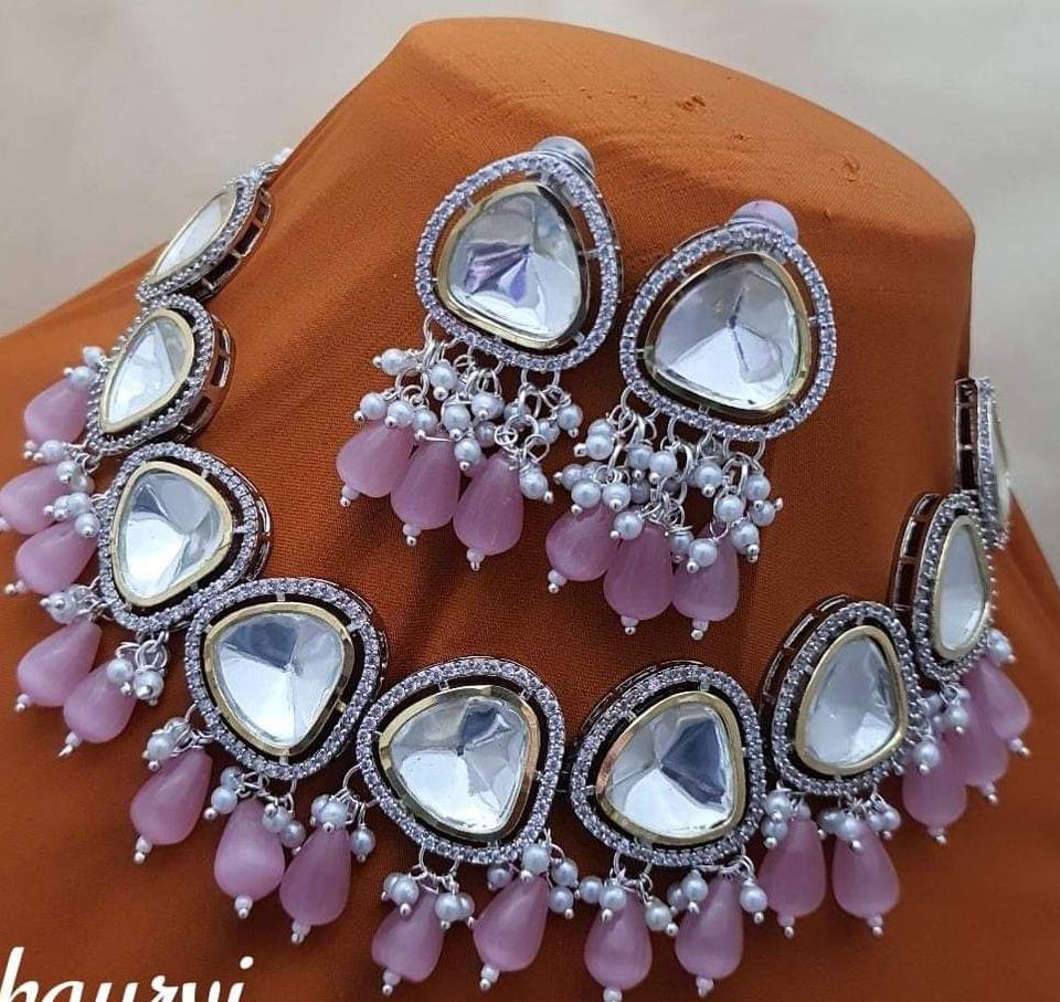 Mirror Polished Kundan Necklace Set with Pink Beads and Pearl Drops Wholesale Customise Handmade Bulk Product