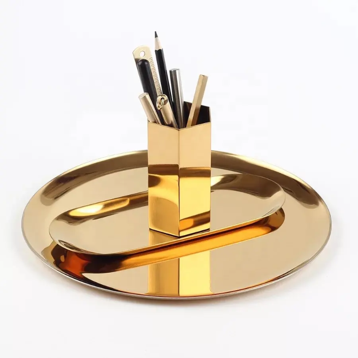 Mirror Polished Pen and Pencil Holder Made of Steel Desk Storage Large Capacity Makeup Brush Holder for Office Shiny Gold Plated
