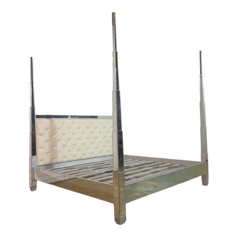 Mirrored Canopy Bed Frame Four Posters Glass Panels Wooden Bed in Silver for Luxury Modern Minimalist Hotel Bedroom Furniture