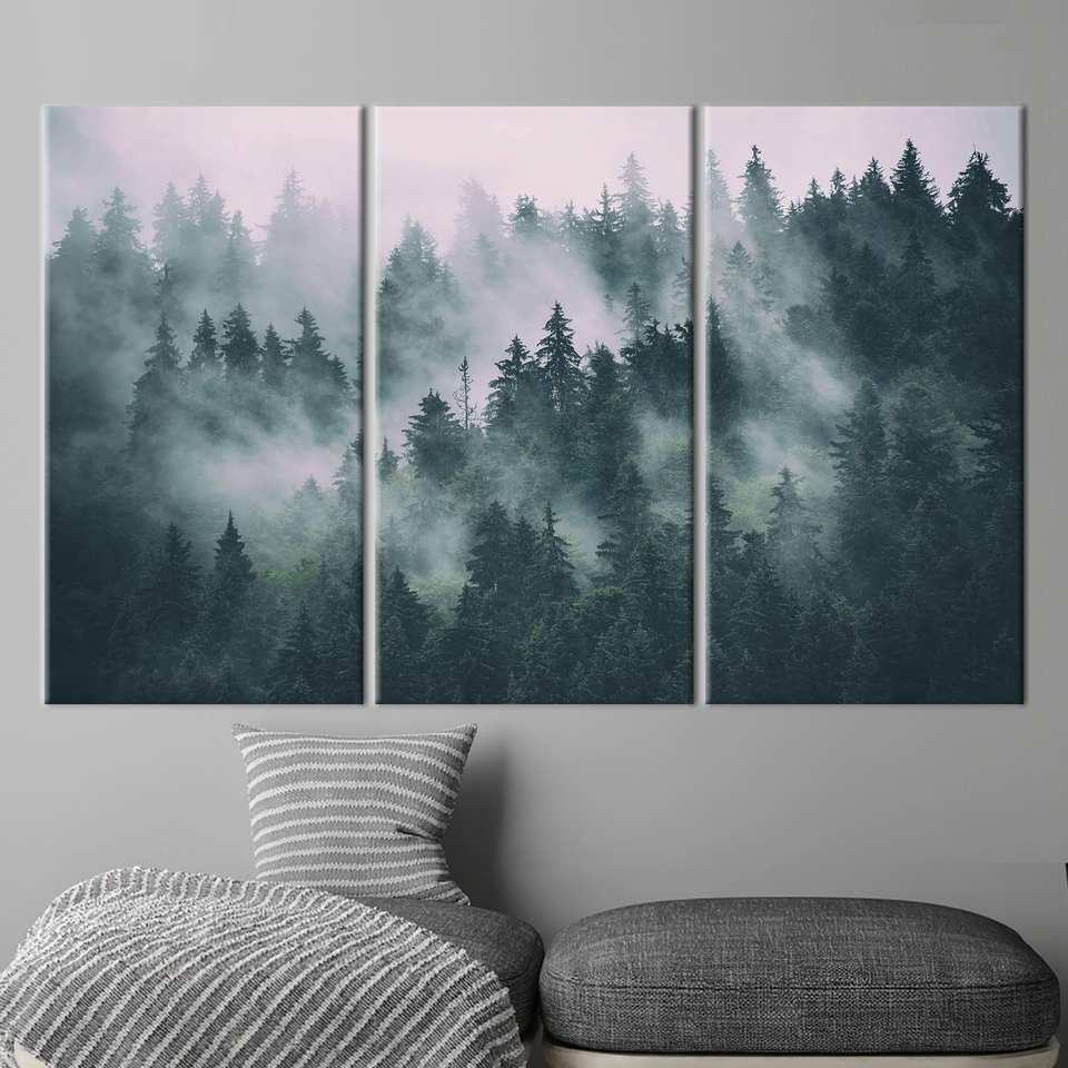 Misty Mountain Printed Canvas: Elegant Forest Landscape Wall Decor,3P:Gallery Wrapped