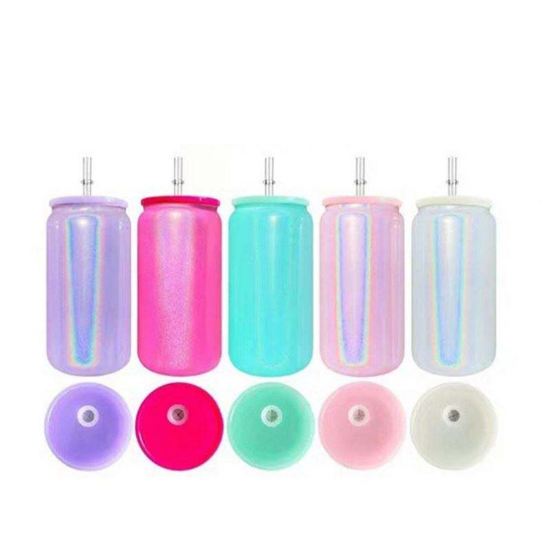 Mixed Colors 16Oz White Glitter Holographic Shimmer Blank Plastic Cup Soda Beer Drinking Plastic Can With Colored Pp Lid