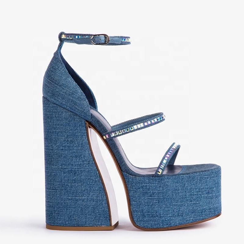 Mixed Rhinestone Denim Sandals Thick High Heel Thick Platform Summer Women's Dress Shoes Ankle Buckles Blue Pumps