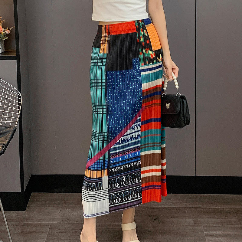 Miyake 2025 Summer New Women's Breathable Natural Waist Pleated Print Midi Straight Skirt Casual Elastic with Loose Fit