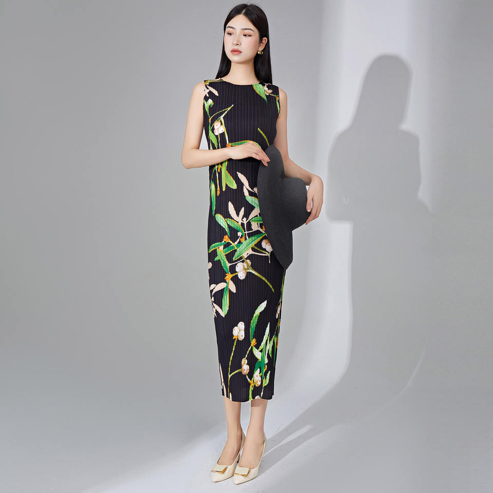 Miyake Dress Long High-end Sleeveless Print Fashionable and Elegant One-step Dresses Pleated Hip Dresses Women's Clothing