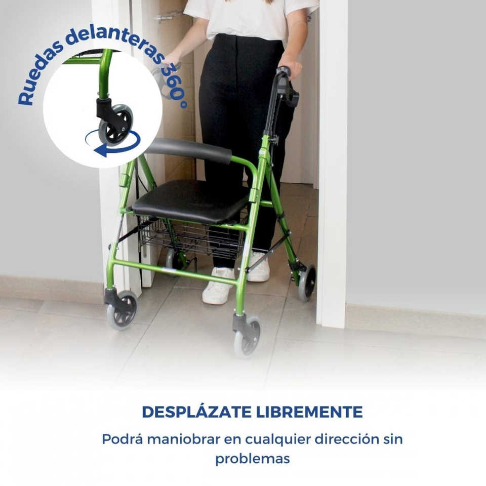Mobiclinic Escorial Green Folding Aluminum Walker with Brakes Seat & Backrest 4 Wheels for Elderly & Disabled People