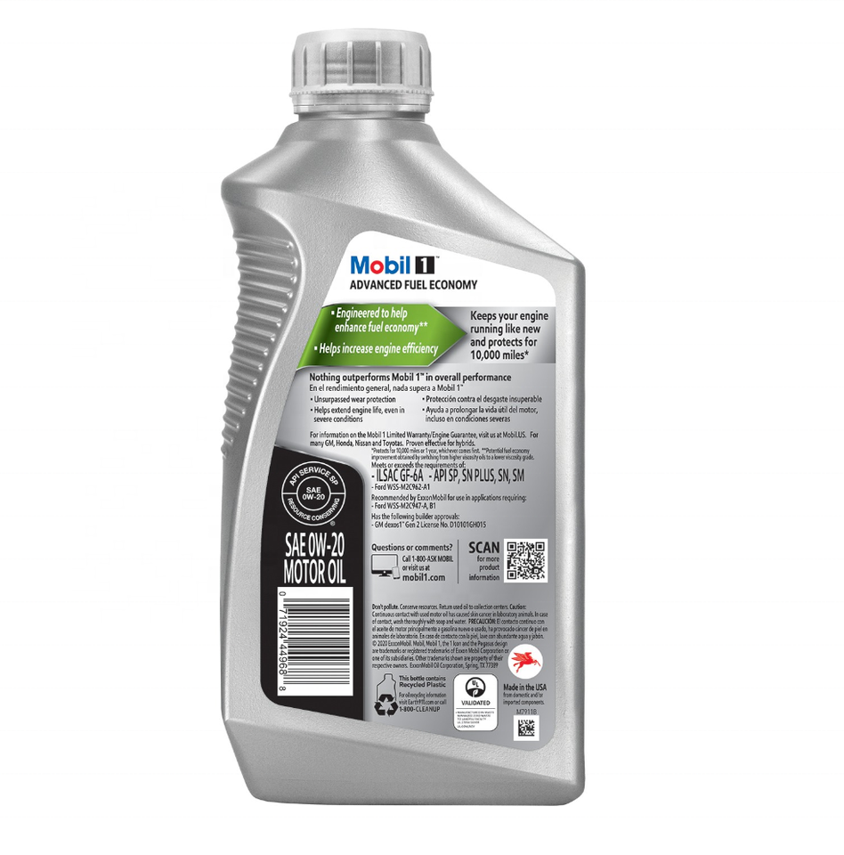 Product name:Mobil 1 Fuel Economy Motor Oil 0W20 Full Synthetic 1 Quart ( Pak of 6)