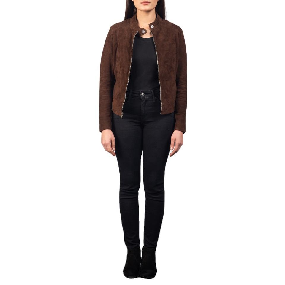 Mocha Suede Biker Jacket For Women Manufacturers Custom - Made High - Quality Artificial Leather Belt Short Motorcycle Jacket