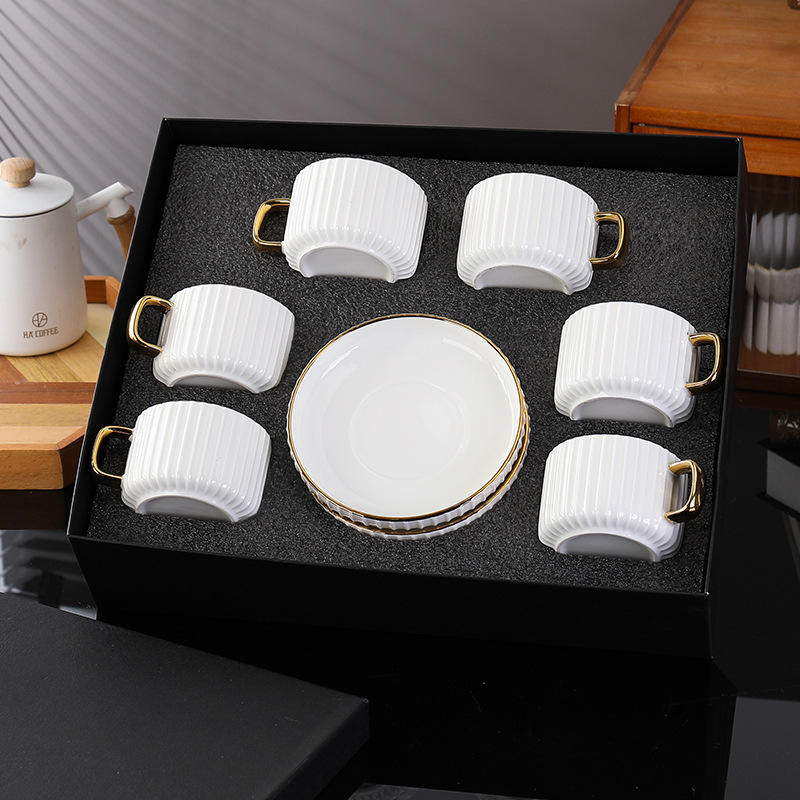 Modern 250ml Gold Handle Ceramic Tea Cup and Saucer Set White Striped Coffee Cup Set of 6