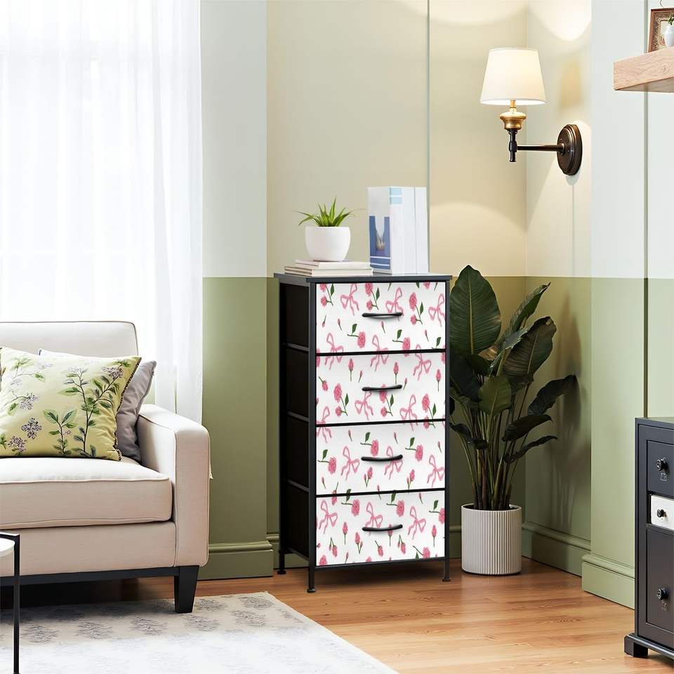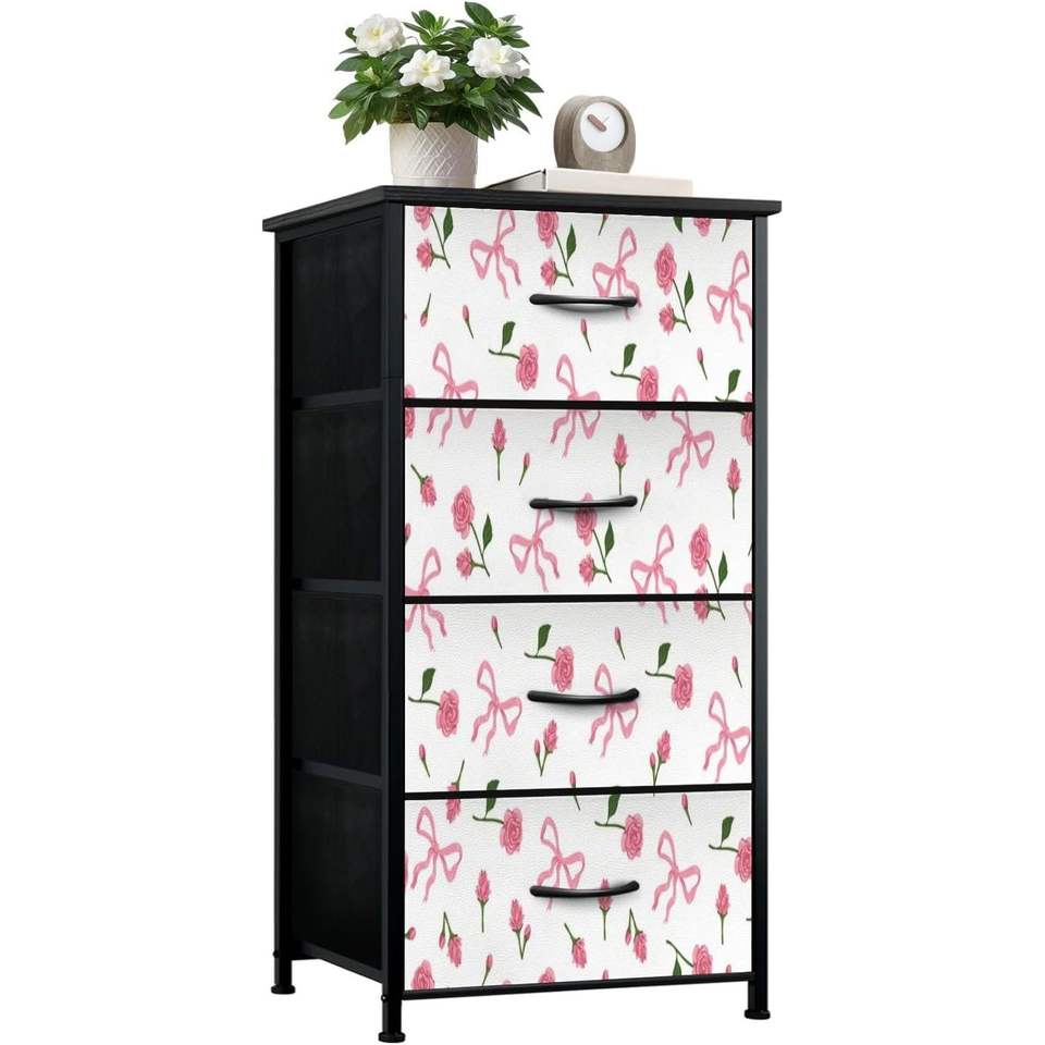 Modern 4-Drawer Dresser with Pink Bows Cherries Print Festive Bedroom Closet Organizer Furniture MDF Wood Home Decor Stock Pink