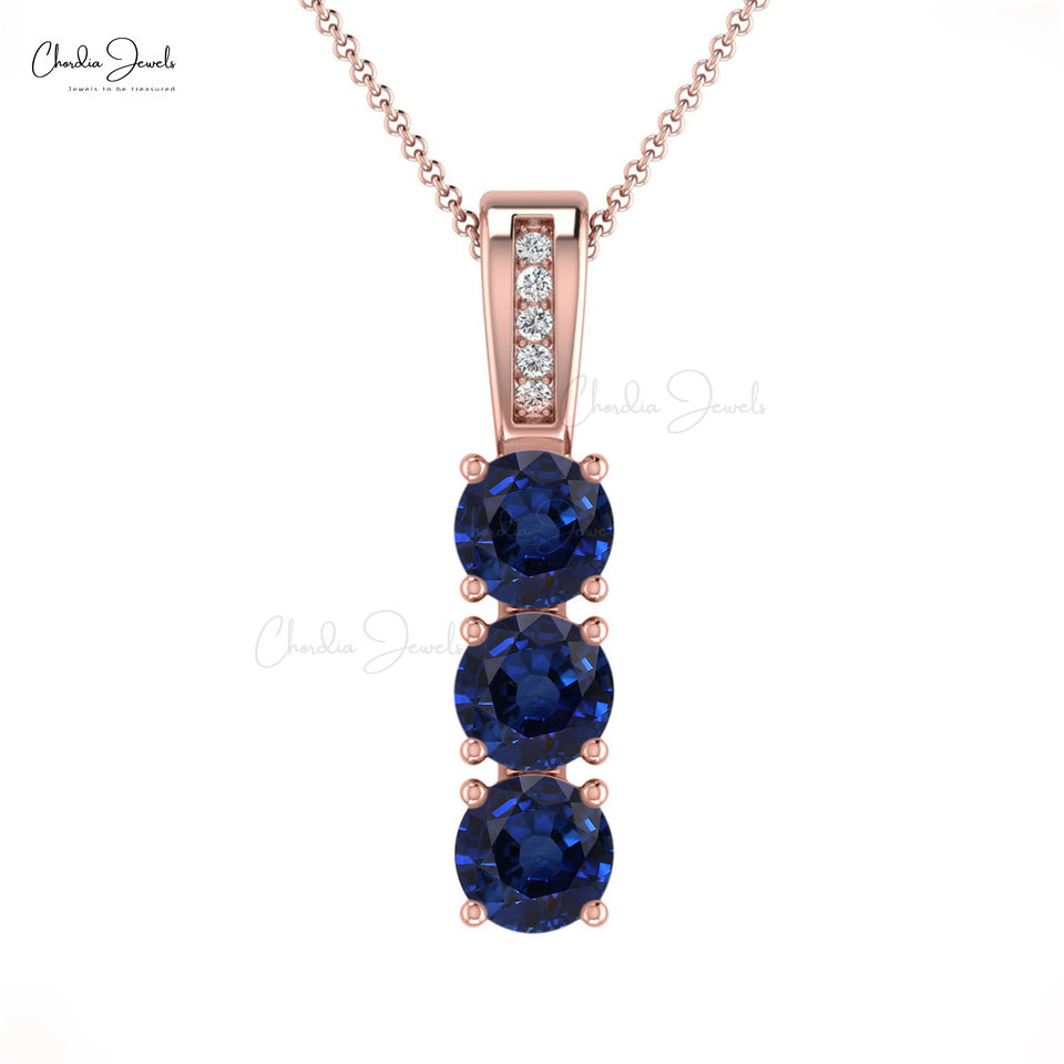 Modern AAA Quality 4mm Round Cut Blue Sapphire & Diamond Three Stone Pendant Necklace With 14K Solid Gold Birthstone Jewelry