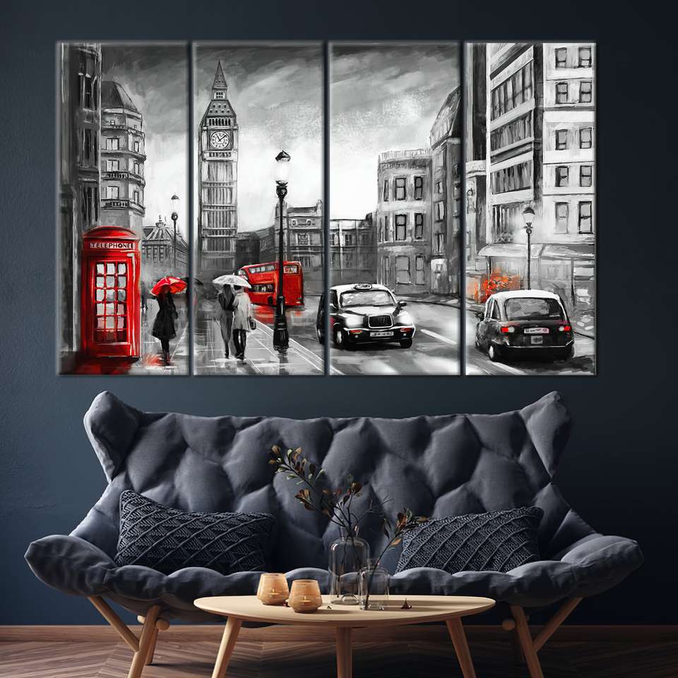Modern Abstract Cityscape Canvas Print, Big Ben Artwork, Red Art Design,4P: Gallery Wrapped