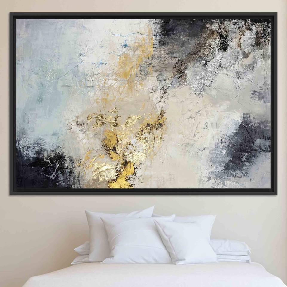 Modern Abstract Plaster Art: Elegant Gray and Gold Canvas Print,BLACK FRAMED CANVAS