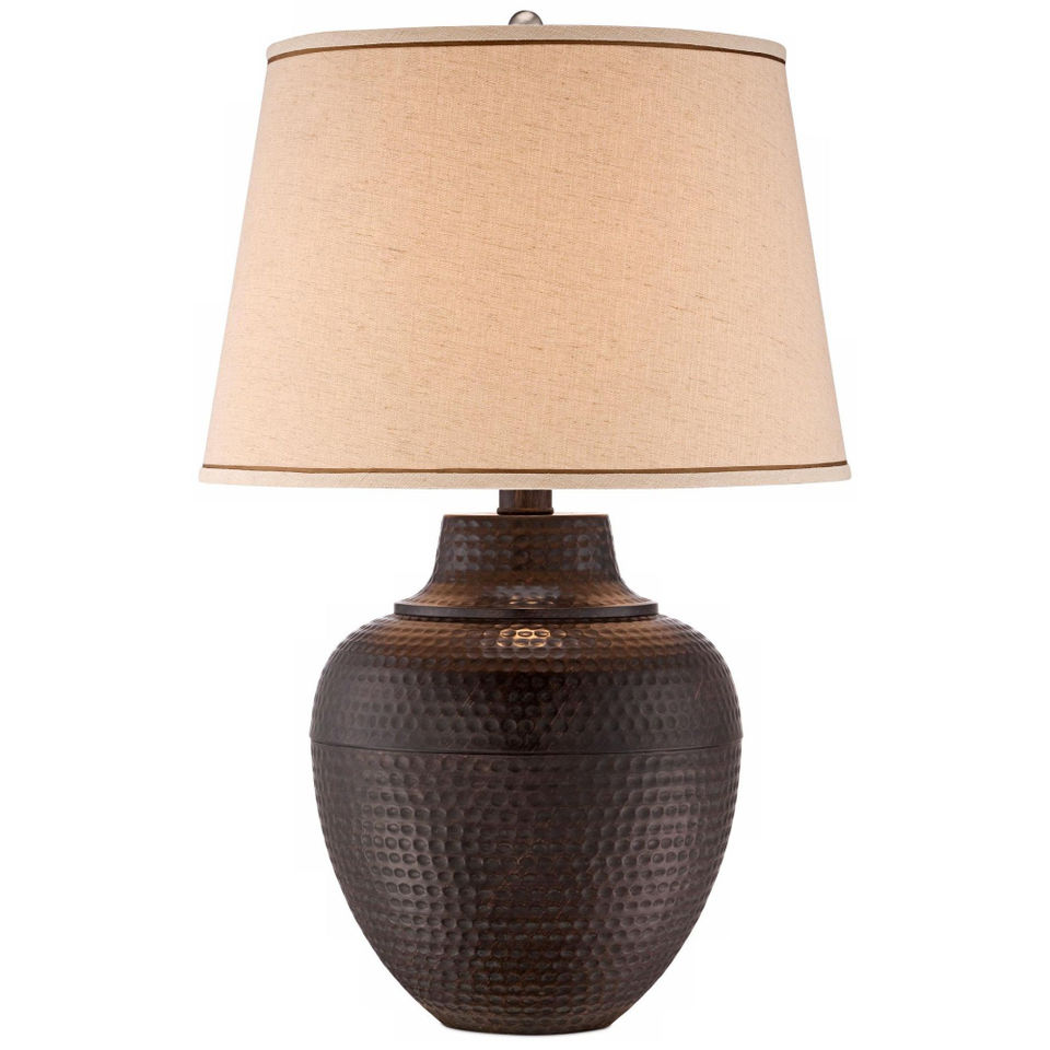 Modern Antique Copper Finish Table Lamp With Textured Honeycomb Spherical Base And Light Beige Linen Drum Shade For Home Decor