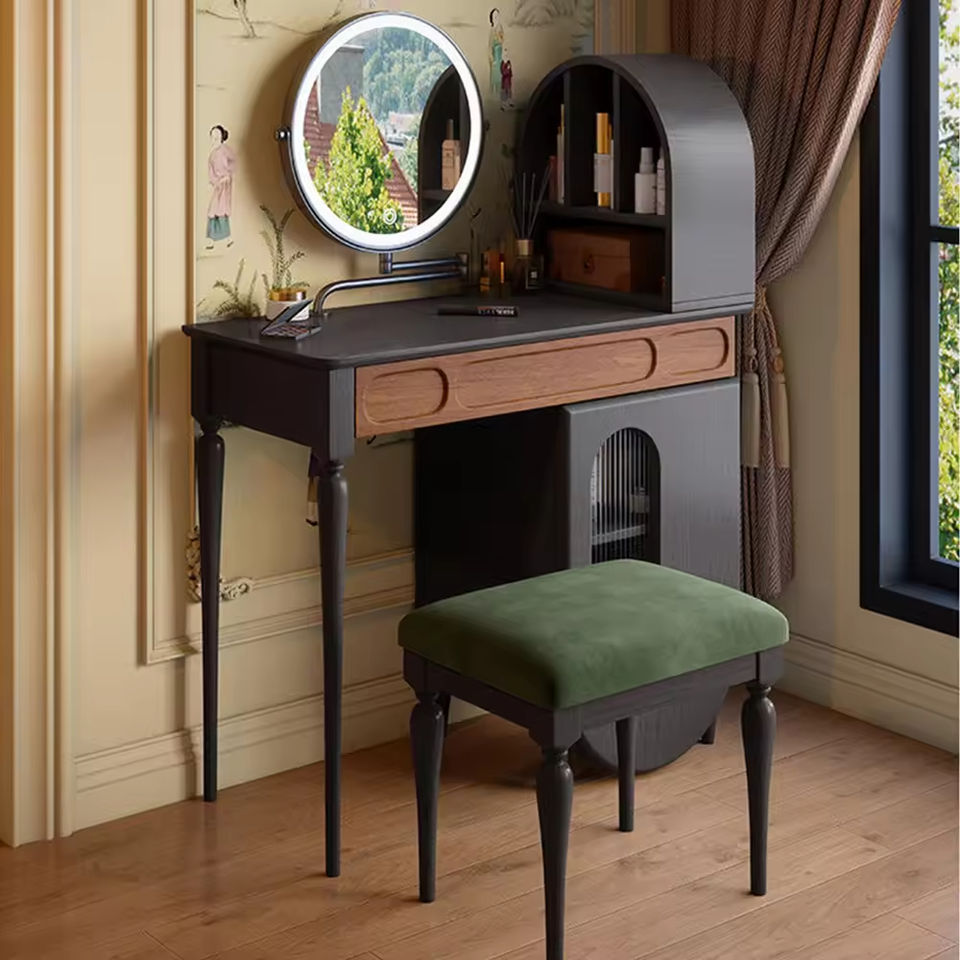 Modern Ash Wood Dressing Table & Vanity Desk with Standing Mirror Rotatable Storage Cabinet Eco-Friendly for Bedroom Hotel Use