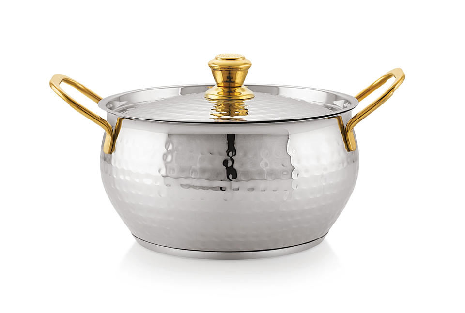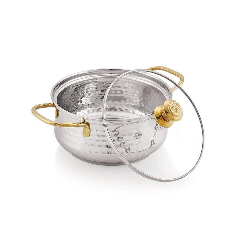 Modern Aura Casserole with Hammered Silver and Gold Finish Smooth Lid Made of Metal for Buffet Decor and Hot Food Serving