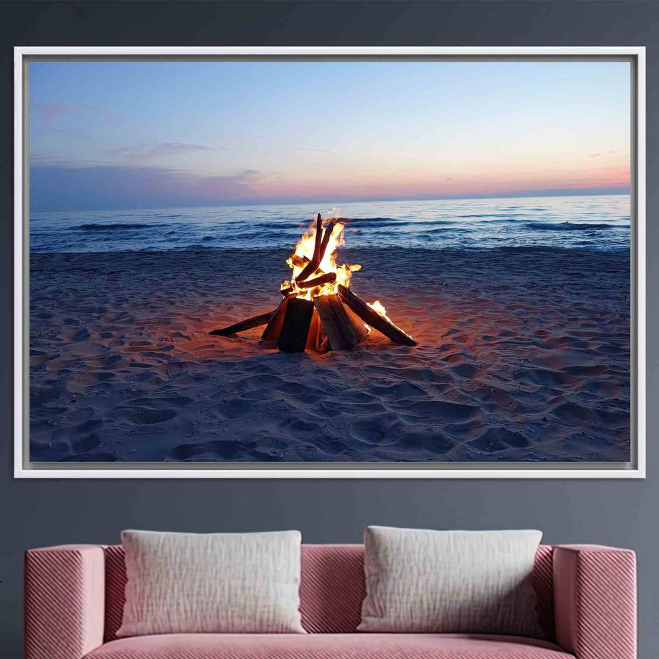 Modern Beach Bonfire Canvas Print: 3D Sea Landscape Art,WHITE FRAMED CANVAS