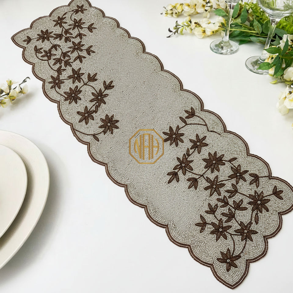 Modern Beaded Decorative Cotton Table Runner Embroidered Blue Floral Design for Weddings and Gift Giving