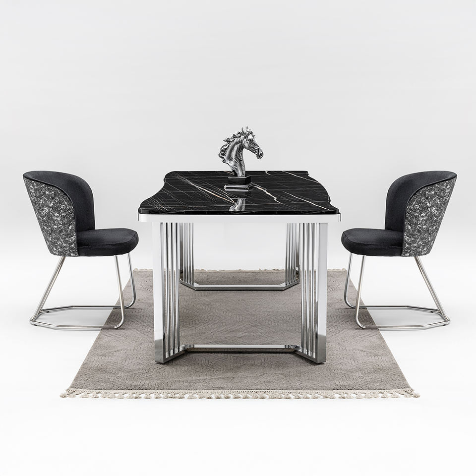 Modern Black Marble Dining Table Set with Chrome Base - Elegant High-End Dining Room Furniture with Luxury Upholstered Chairs