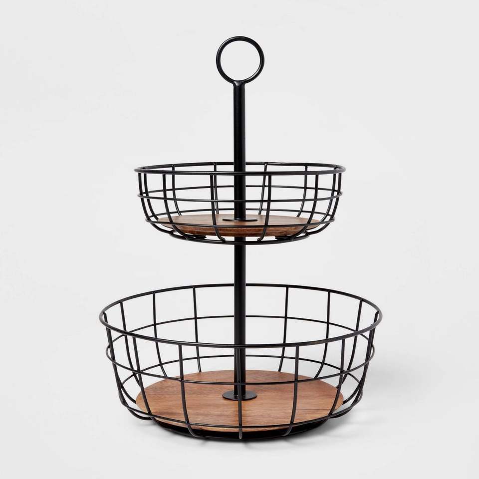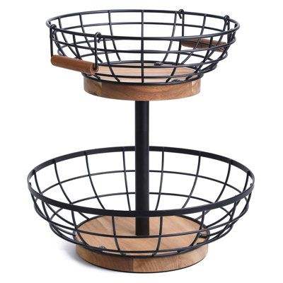 Modern Black Metal Two Tier Basket with Wooden Base for Stylish Kitchen Storage and Elegant Home Decor Display Stand