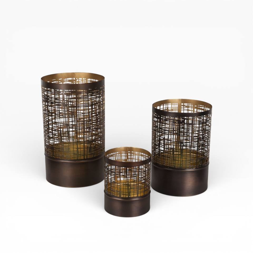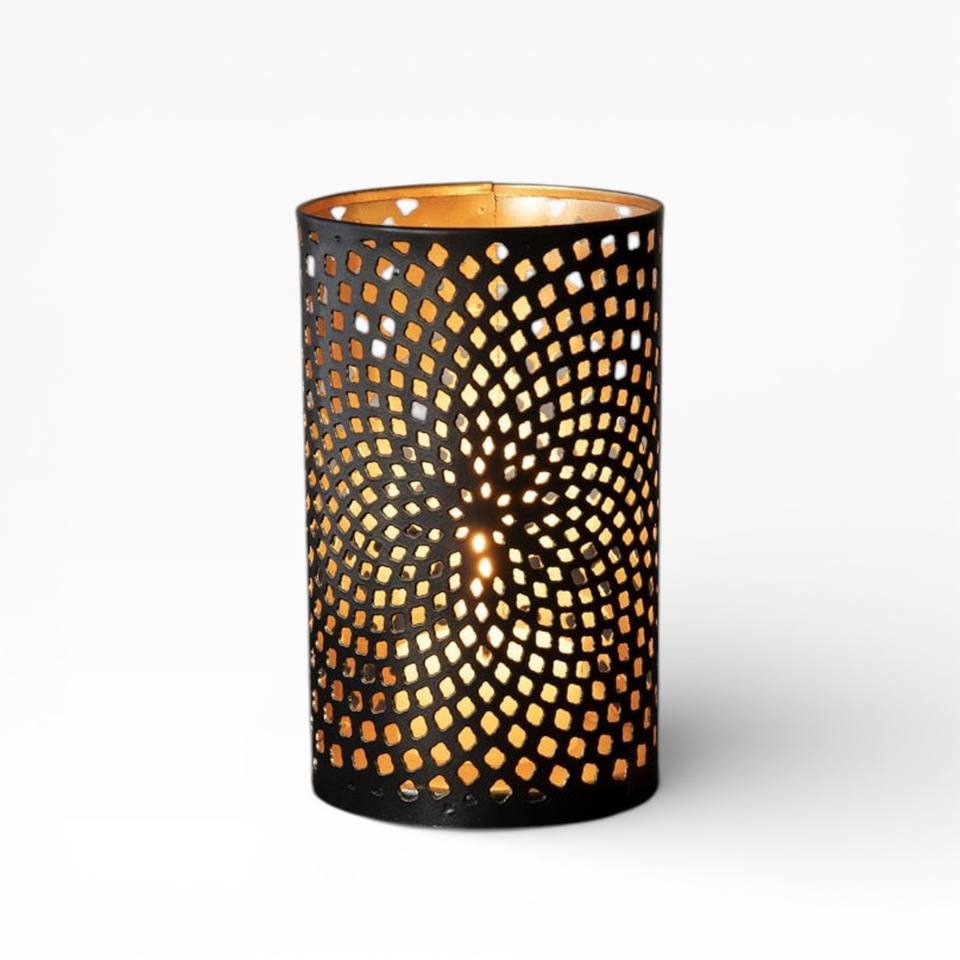 Modern Black Metal Votive Candle Holder Pair with Diamond Lattice Cut Pattern and Gold Interior