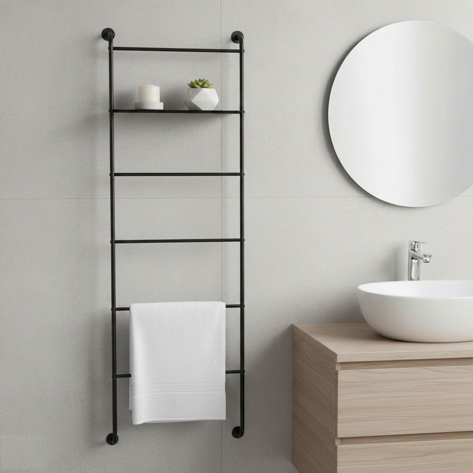 Modern Black Towel Ladder Stand Made of Iron with Practical Bathroom Storage Shelf for Towels and Accessories