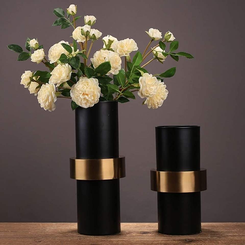 Modern Black and Gold Decorative Vase metal with a matte black finish and a polished gold-toned metallic band around the center.