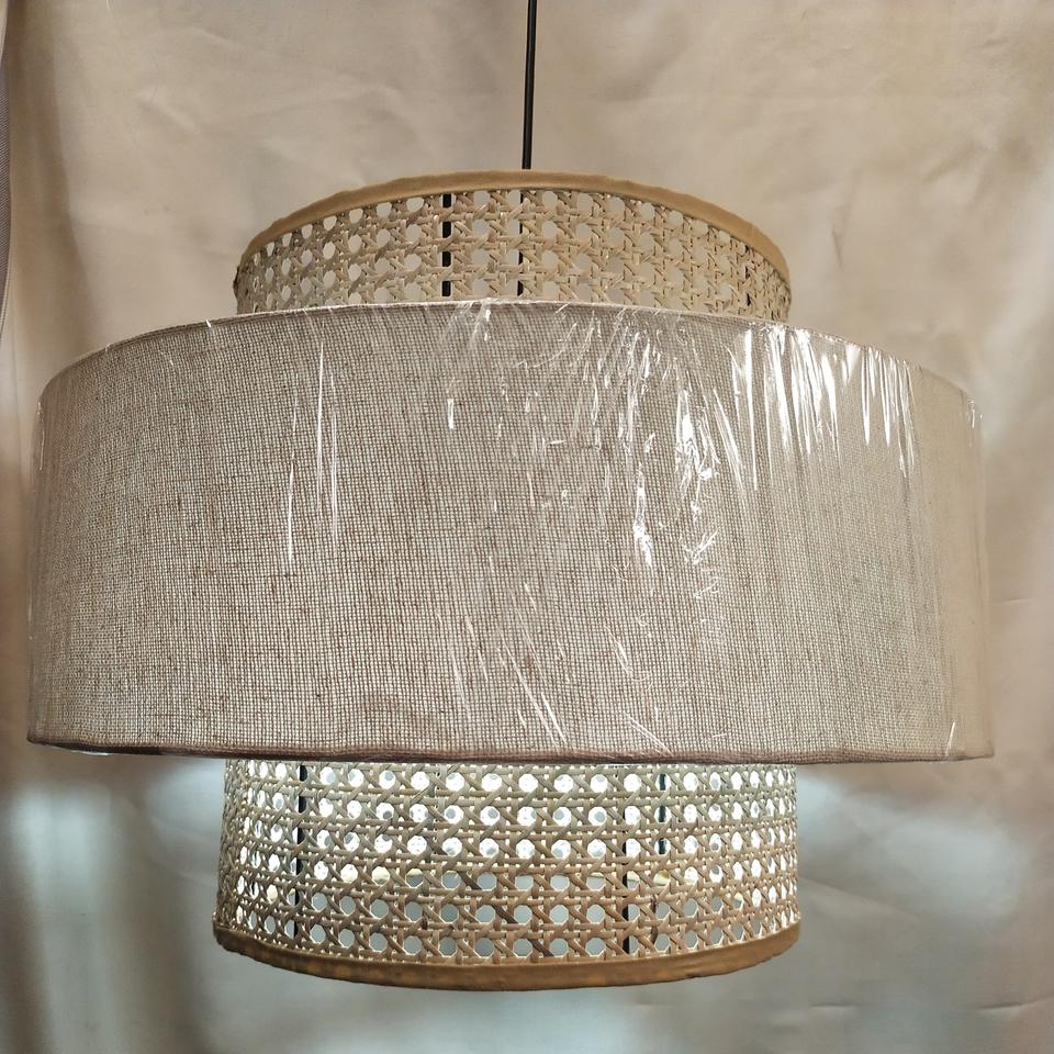 Modern Boho Cane Webbing and Linen Pendant Light | Natural Rattan Weave Dual-Layer Hanging Lamp Shade | Decorative Bamboo Fiber