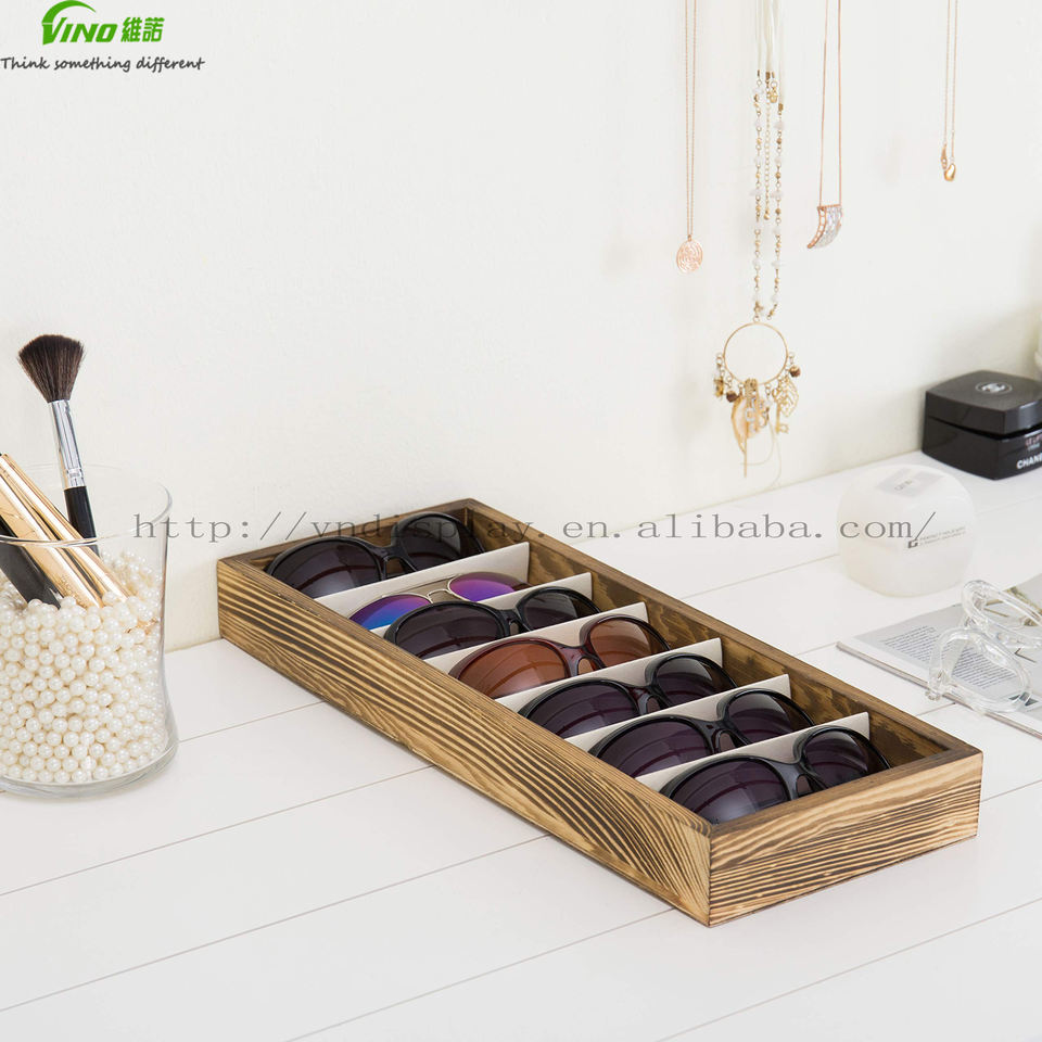 Modern Open Top Sunglass Organizer Brown Wood 7 Compartment Storage Box Eyewear Display Case