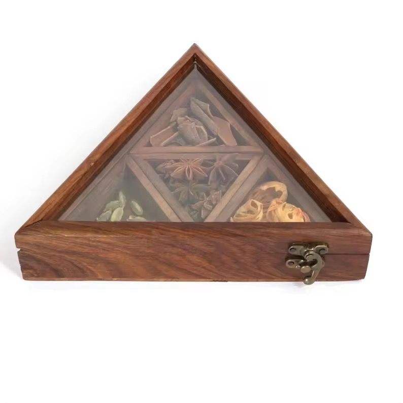 Modern Brown Wooden Spice Box Vintage Removable Custom Triangle Handcrafted Wooden Spice Box Masala Dabba
