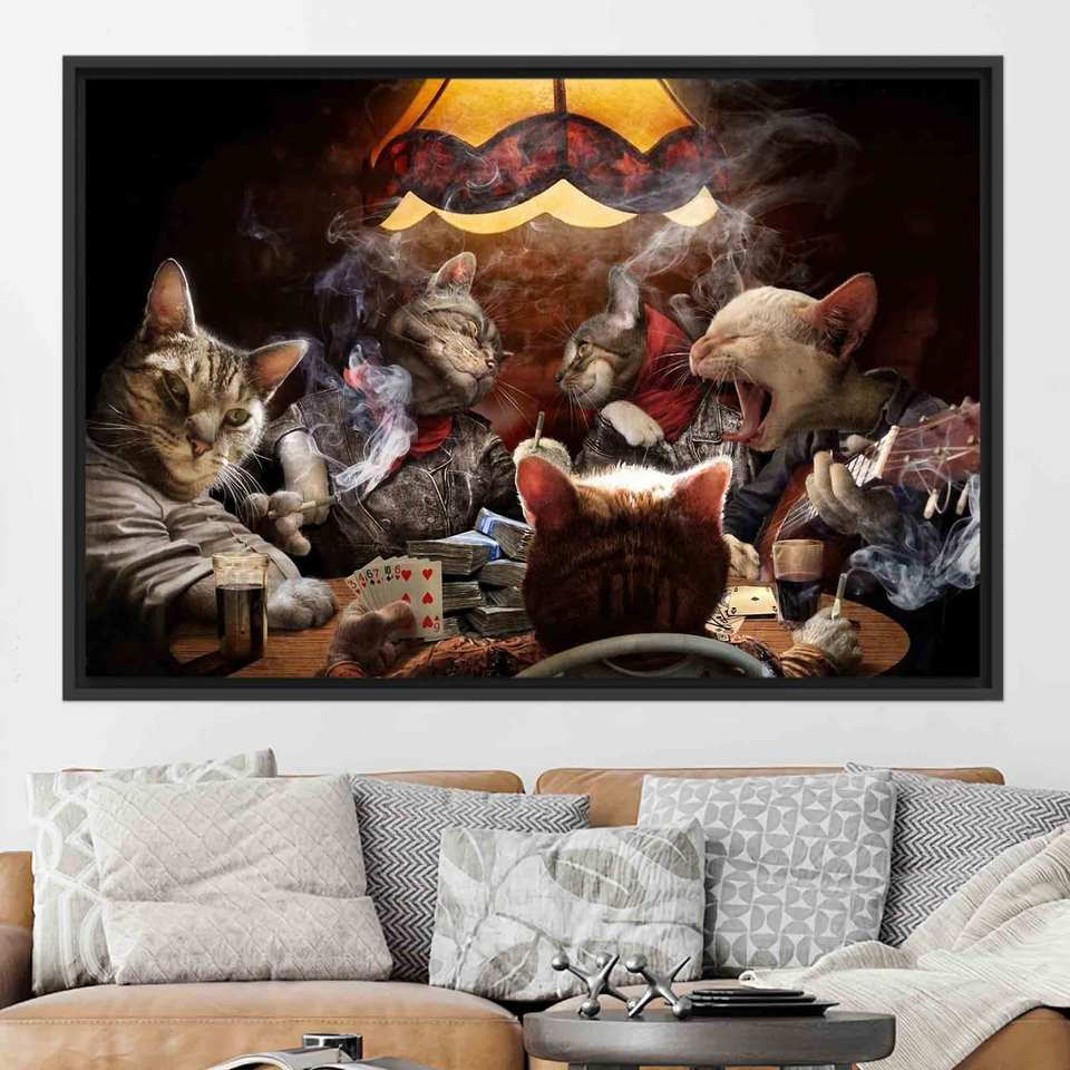 Modern Cats with Playing Cards Wall Art, Printed Canvas for Home Decor,1P:Black Framed