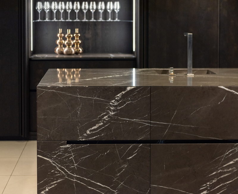 Modern Classic Luxury Australian Standard Modular Kitchen Cabinets Black Melamine Finish Island Design MDF Lacquer Marble