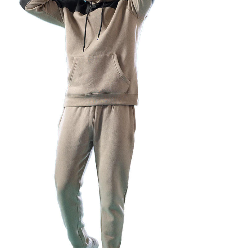 Modern Color Block Hoodie Sweatsuit Men's Two-Tone Beige & Black Fleece Set Pullover Hoodie and Drawstring Joggers At Wholesale