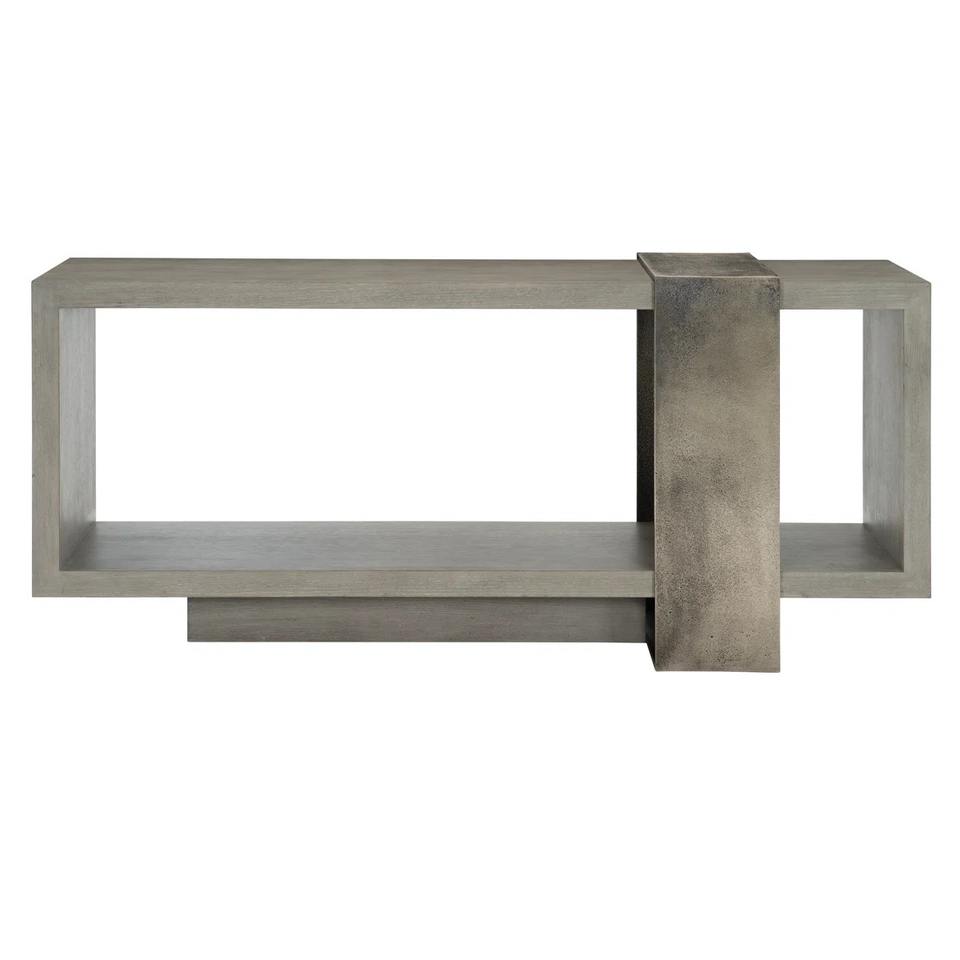Modern Convertible Mirrored Console Table with Grey Wood Finish Textural Metal Band Accent Open Shelf Design for Entry Hotel Use