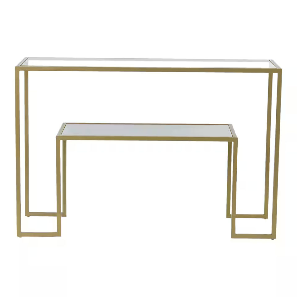 Modern Contemporary 2 Shelf Console Table Brass Finish Metal Frame With Antique Mirror Glass Top Rectangular Entryway Sofa Table