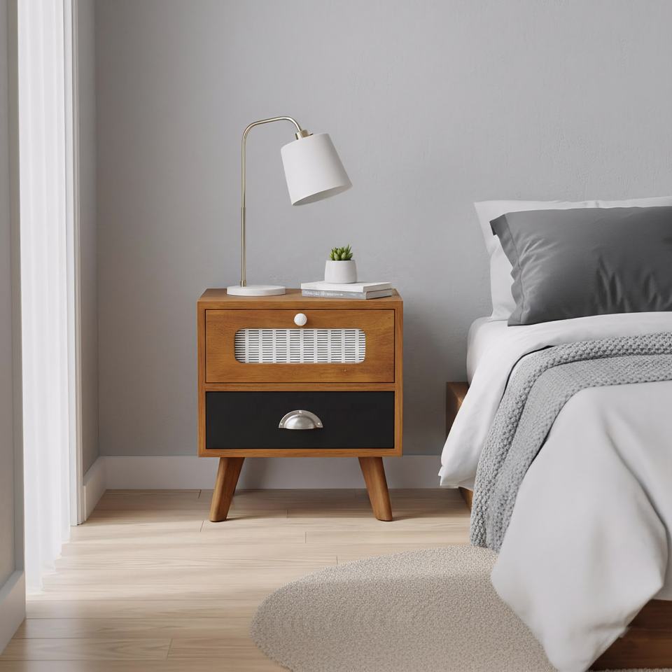 Modern Contemporary Solid Wood Bedside Table Two Drawer Storage Tapered Legs Compact Nightstand Stylish Living Room Home