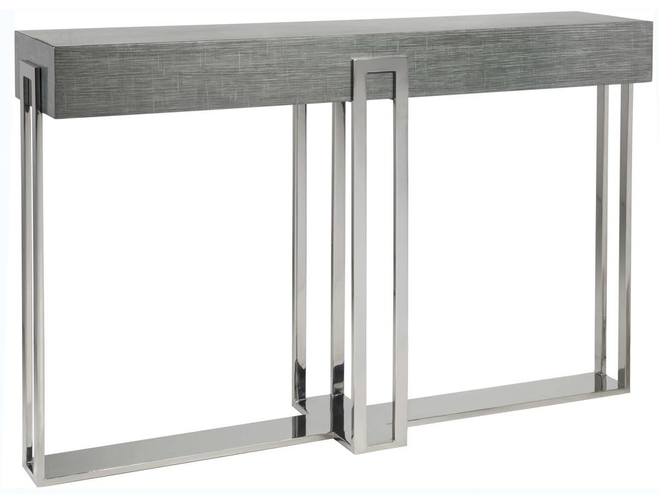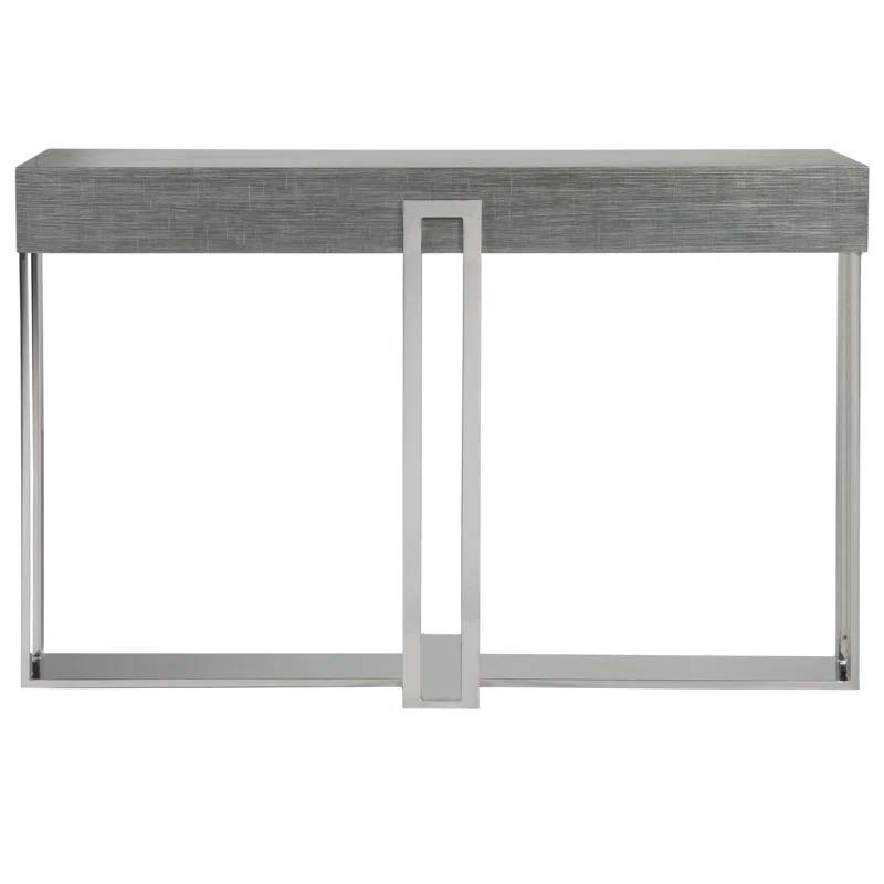 Modern Convertible Mirrored Grey Console Table with Textured Linen Look Finish Silver Metal Geometric Base for Entry Hotel Use