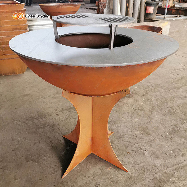 Modern Corten Steel BBQ Island Outdoor Kitchen Charcoal Fire Pit with Tepanyaki Grills Remote Control & Auto Ignition