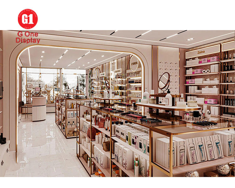Modern Cosmetics Shop Interior Decoration Wood Veneered MDF Makeup Display Cabinet Perfume Display Shop Fixture