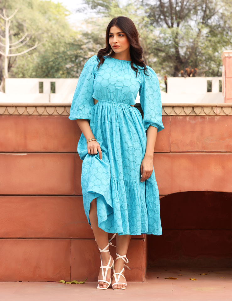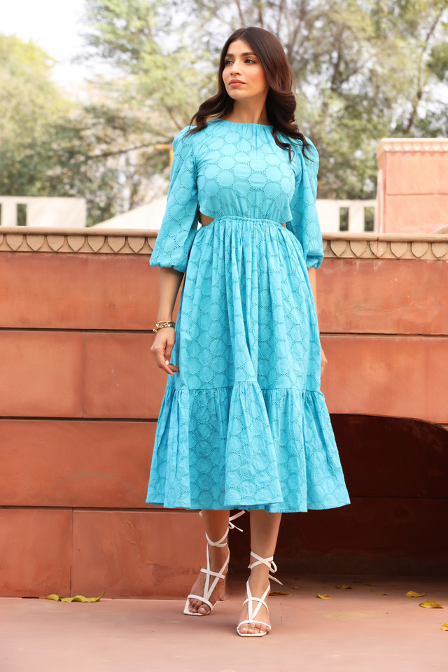 Modern Cotton linen Dress charming blend of elegance and playfulness Made from soft cotton schiffli blue midi dress flared maxi