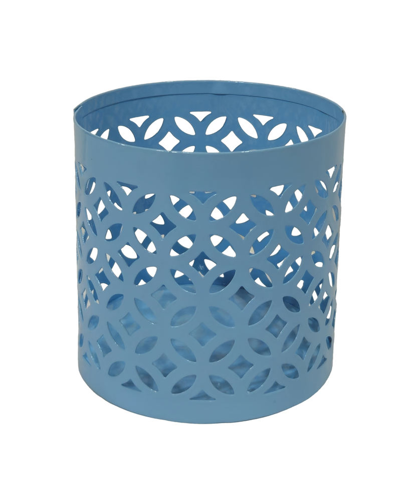 Modern Decorative Blue Metal Hollow Cut Out Waste Bin Basket Durable Iron Mesh Office Desk Organizer for Living Room Bedroom