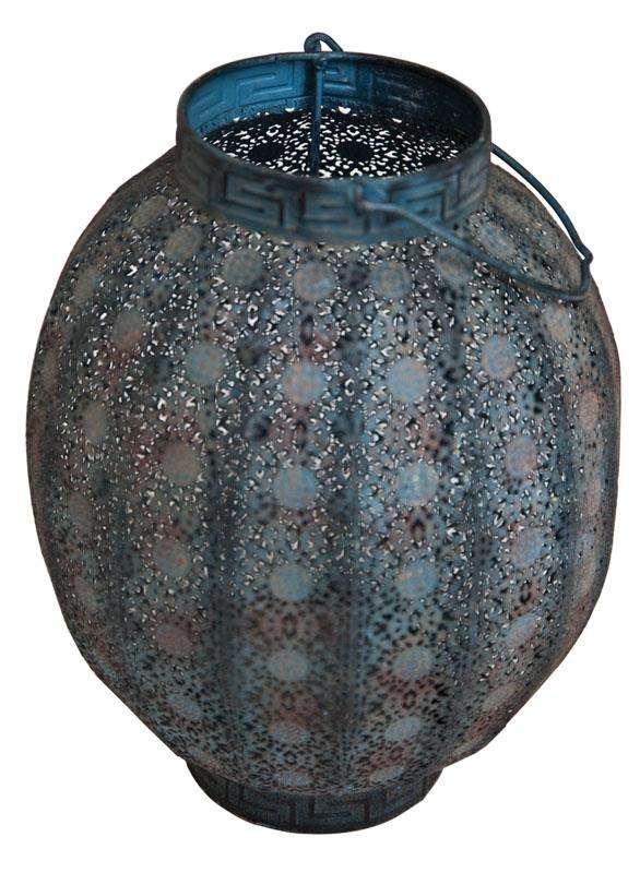 Rustic Outdoor Decorative Lantern Weathered Metal Hanging Candle Holder Moroccan Inspired Patio Lantern with Natural Rope Handle
