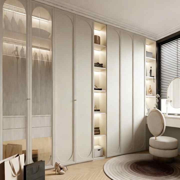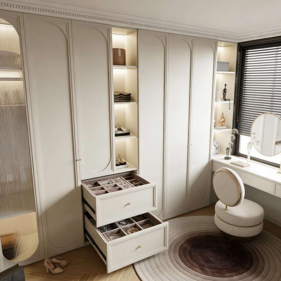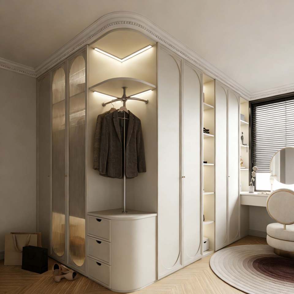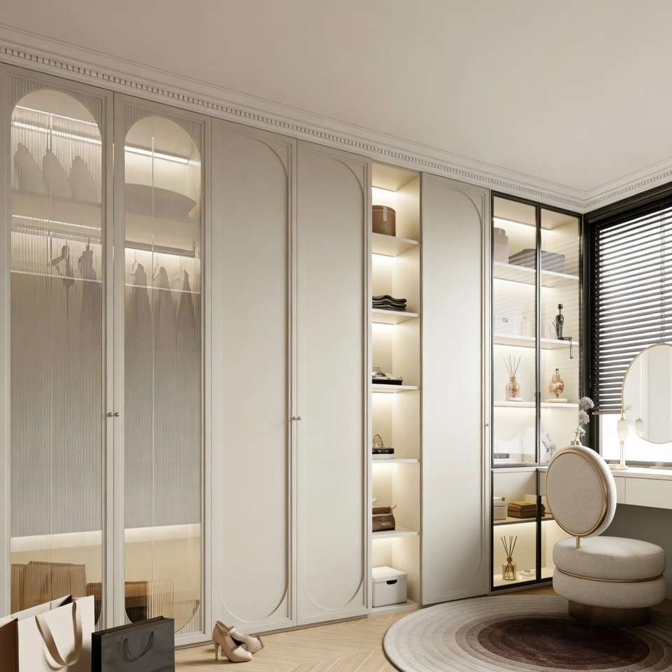 Modern Design Luxury Bedroom Wardrobe Clothes Storage With Arched Glass Doors Integrated LED Lighting & Vanity Nook