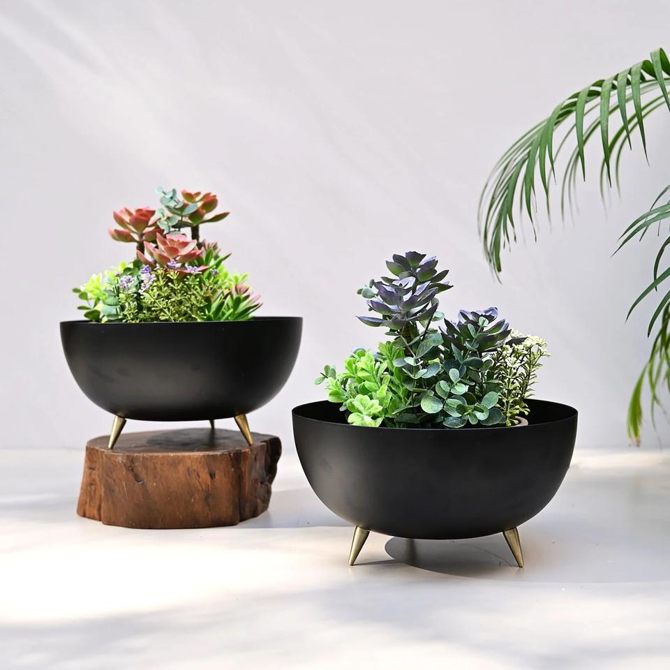 Modern Design Luxury Tabletop Artificial Planter Pot Small Succulent Black Flower Pot Golden Legs Metal Round Flower Planter Pot