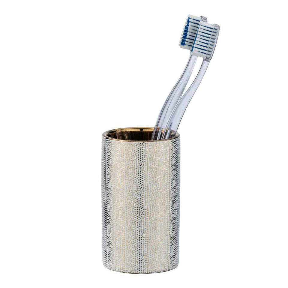 Modern Design Metal Gold Toothbrush Holder Cup White Textured Bathroom Countertop Tumbler Organizer Hotel Home Decor Accessory