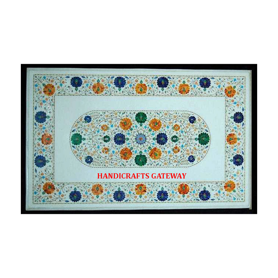Modern Design Standard Quality Luxury Natural Shade White Marble Inlay Work Table Top Rectangular Shape Beautiful Flower Tables