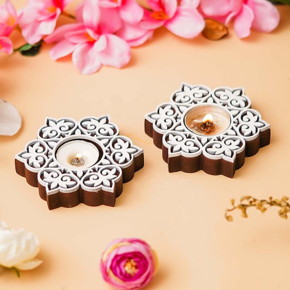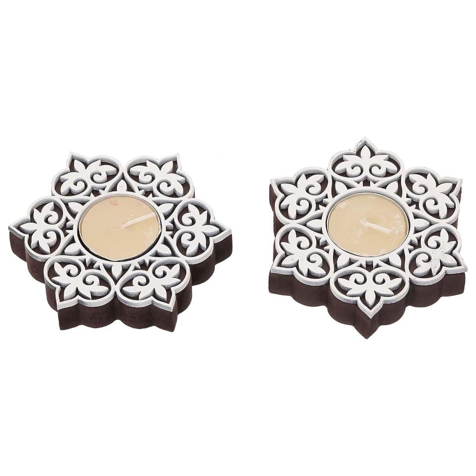 Modern Design Wooden Floral Block Print Decorative Tea Light Candle Holders Diya Stands Christmas Decoration Item for Home Decor